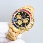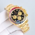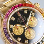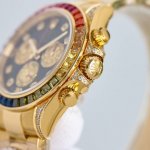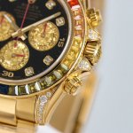 劳力士彩虹圈迪通拿 DDD 铂金眼 Cal.7750机械计时, DDD “二代彩虹迪通拿”表壳、表带采用316L精钢材质打磨,每个壳套全程Cnc处理所有细节,再经过人工流程润饰,打磨和检测做工精细,圈口角度与宝石大小数量颜色跟彩虹渐变效果一致,玻璃使用蓝宝石透彻效果镜面,机芯采用7750全自动计时机械机芯,表带分别全人工镶钻精钢实心表带Or进口氟橡胶表带,配备防止意外打开的蚝式保险扣,佩戴舒适,操作也十分简便! DDD 这款腕表最大的特点莫过于表圈的七彩宝石和字面的十二个彩钻刻度,彩色渐变效果一一对应,这