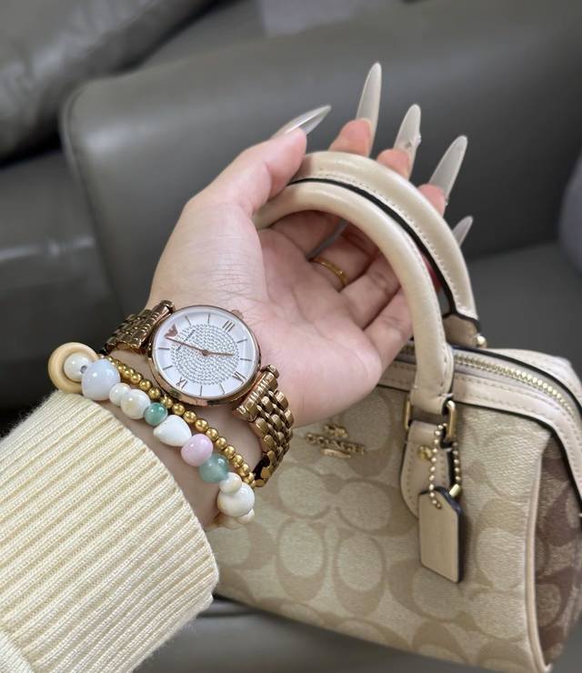 阿玛尼时尚新款休闲女士腕表,佟丽娅同款,腕美展现,熠熠生辉,多彩优雅姿态,璀璨表盘复古罗马刻度,水钻点缀表圈,灵...