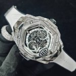 Hb 恒宝Hublot 宇舶 刺青二代V3版 计时机械款 剑锋 全新Big Bang Sang Bleu Ii 刺青腕表 再次与知名刺青工作室Sang Bleu合作,推出又款利用几何图形巧妙构思的刺青Ll腕表,完美演绎了该品牌的雄心壮志和设计理念。刺青Ll腕表运用了更为精细的线条设计,打造出立体生动的三维视觉体验。145Mm表壳直径,图形元素贯穿表壳,通过切割和雕刻融入到六边形表圈之中。6颗H型钛金螺钉牢固定表圈。表耳处带有很强的设计感,角度陡峭,线条硬朗。2表盘最为抢眼的就是菱形的时分针和两个六边形的盘