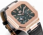 亮点特色:功能日期显示,星期显示,月相都是真功能。机芯:搭载改装240ps偏心迷你锤,机芯走时稳定表带:表面定制牛仔纹背面小牛皮,扣子折叠原装扣款式,在表壳六字位镶嵌一颗0.02克拉方钻石是一个低调亮点,蓝宝石镜面玻璃,表壳:尺寸45毫米厚度11Mm,为表壳对角线长度 即10点位至4点位 ,因为表壳近似于方形,上下边的宽度会小于这一数值,所以视觉效果并不