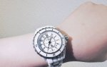 / 今天这款香奈儿手表是孩子妈一直喜欢戴的,小巧精致,辨识度高。 这款是石英机芯的,还有一款是机械的哦。 手表整体是白色陶瓷材质,拿在手上质感好。最吸引人的是它的表