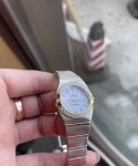欧米茄黄金双鹰星座系列女表 24毫米表盘 天然珍珠贝母盘面 Vvs天然真钻石刻度 Vvs天然真钻石圈口 里外原镶钻 蓝宝石镜面 搭载欧米茄Cal.1376瑞士原装石英机芯 底盖八位钢印身份证号59551104清晰可见 整表全原装 整表金色部分全都是纯实心18K黄金材质永不褪色 专柜售价61100现货放大漏16750