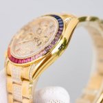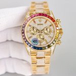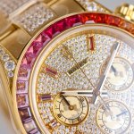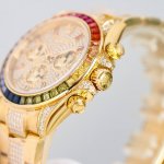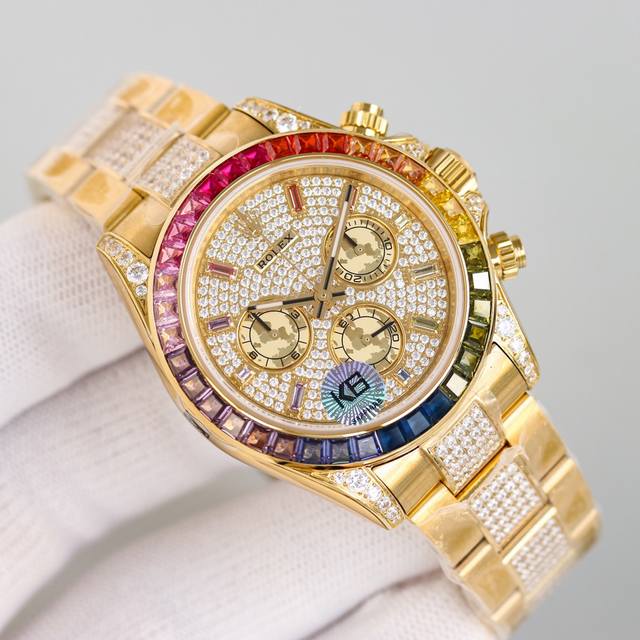 统一价 Sgp工厂P 最新第二代迪通拿彩虹款! “晚虹斜日塞天昏,一半山川带雨痕”。纯黑的表盘仿佛是黄昏背景,更突显表盘及外圈上斑斓的彩虹刻度,而表耳及护肩的钻石就像雨滴一般,带有莹润透亮的质感。 与第一代相比,今年的新款彩虹迪主要有三个壳变化,分别在表盘刻度、指针颜色和表壳材质! 到了第二代,劳力士去掉了方形大包钻刻度,换用了上条形宝石刻度。更难能可贵的是,这些宝石刻度的排列同样呈现渐变效果,且和外圈渐变宝石的色泽一一对应。 “二代彩虹迪通拿”表壳、表带采用316L精钢材质打磨,每个壳套全程Cnc处理所
