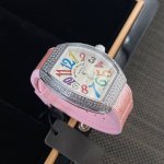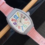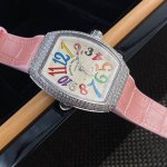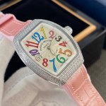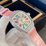 Franck Muller 法兰克穆勒 Fm V32 高级珠宝系列瑞士石英尺寸32*42.3Mm,酒桶形外壳,全手工镶钻,太阳压纹折射表盘,浮雕数字时标,Vanguard系列的美学风格 采用经典的橡胶 进口小牛皮表带贴面