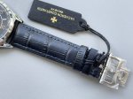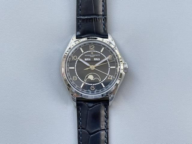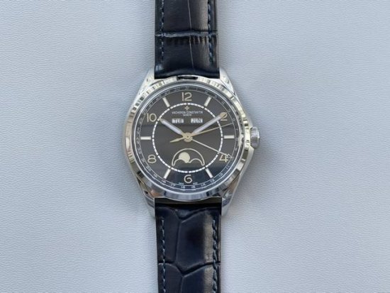 Mx厚积薄发 真“芯”力作 Vc江诗丹顿伍陆之型 Fiftysix全日历系列 腕表 型号 4000E 000A-B548 B439 B438 B065 表壳 尺寸40Mm×11.6Mm,真正同步原装。旋入式表冠和造型独特的盒式蓝宝石水晶镜面,提升耐磨耐用性的同时,保留了Fiftysix伍陆之型系列的复古韵味。 表盘 12点钟位置两个矩形视窗,分别可以显示星期和月份。日期显示位于表盘外缘,由带箭头的烤蓝指针指示。6点钟位置为月相显示,由蓝色的夜空和白金月亮组成。刻度圈配以白金材质的阿拉伯数字和棒状时标,与深