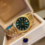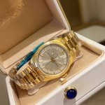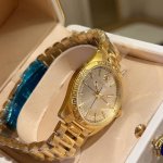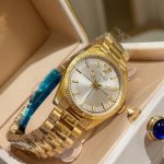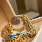 金 Versace Millenyium Lady腕表,表壳上 12 点位置饰有品牌标志性Medusa和Versace Logo,彰显力量与精致感。内表盘、表圈环以及金属圈雕刻有Greca图案,设计优雅。所有Versace腕表均有“瑞士制造”标志。所有不锈钢均为可回收材料。 DDD 表壳:精钢表壳,表圈环饰有Greca DDD 表盘:绿色玑镂刻花表盘,12点位置饰有Versace Logo和Medusa 内圈饰有Greca DDD 表带:双色 Ss&In 表带,配以蝴蝶扣以及Greca细节 DDD 机芯: