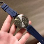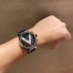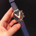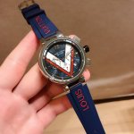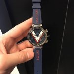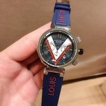Louis Vuitton路易威登,Tambour Damier Cobalt 腕表系列的一款腕表由精钢材质打造,表盘装饰对比强烈的红白图纹,并进一步由天蓝色秒针加强。醒目颜色表带,诠释真正的运动内涵,42Mm,非常值得入手 DDD
