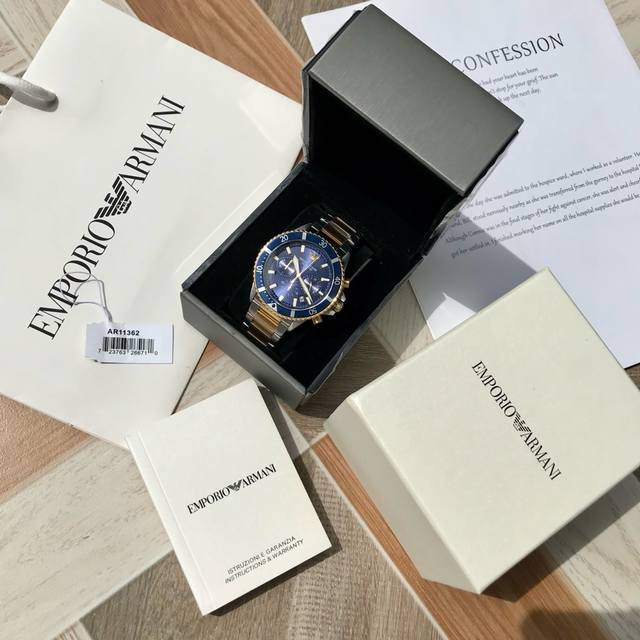 新款到!原厂阿玛尼男士腕表,Ar11362,水鬼系列,现代感与经典品味于腕间大气表露,款式时尚又复古,三盘六针,功能强悍,彰显酷雅商务型男,一如既往的精美鹰标设计呈现绅士魅力,表径~43Mm,配全套包装出! DDD