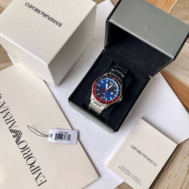 / 新款到货!Gmt双时区水鬼款!原厂阿玛尼Armani 石英男表,双时区指针,专柜新款!Ar11590,可单向旋转的最潮拼色圈口,搭配柳叶形指针设计,刻度与指针自