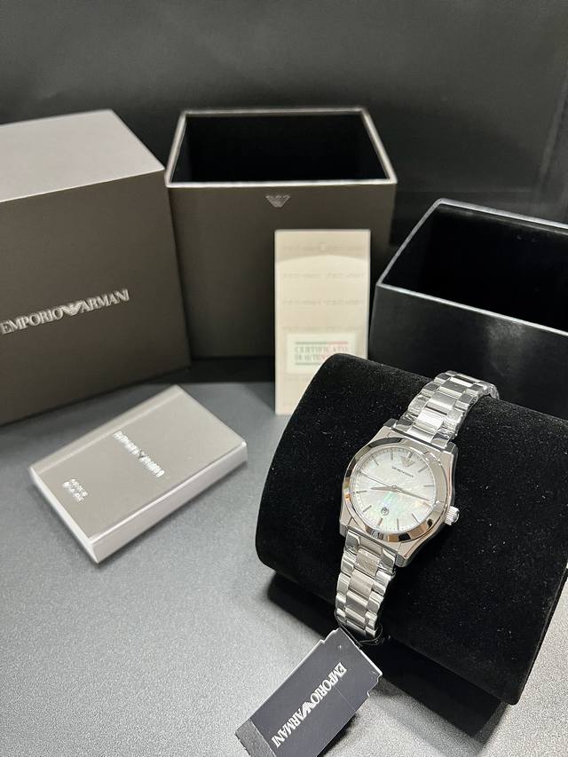 FFF 贝母流光 白露诗篇 DDD Ar11557 DDD 阿玛尼32Mm贝母石英表 以天然虹彩镌刻极简优雅 DDD 纯白贝母表盘蕴藏七彩光晕,每寸纹理都是时光的指纹 DDD 精钢表链勾勒冰雪质感,进口石英机芯, DDD 32Mm迷你表盘绽放低调华光,通勤约会皆成风景 ,配包装出! DDD