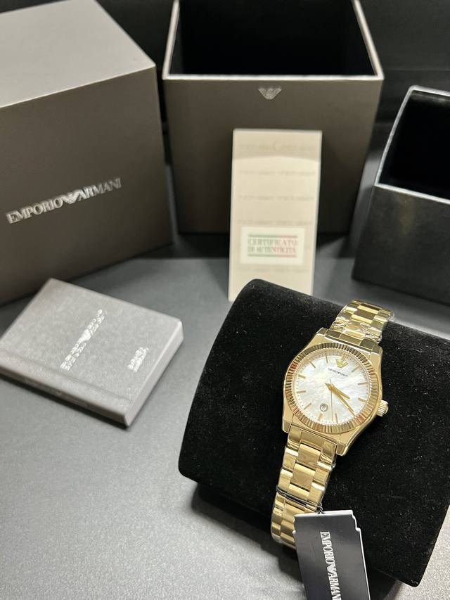 FFF 鎏金贝语 优雅成诗 DDD Ar11657 DDD 阿玛尼32Mm贝母石英表 以天然虹彩诠释轻奢美学 DDD 白色贝母表盘流转梦幻光晕,每道纹路都是自然的独家签名 DDD 金色表身镶嵌金色字钉,与腕间肤色辉映成暖阳 DDD 进口石英机芯,32Mm尺寸勾勒名媛气质 DDD 配包装出! DDD