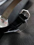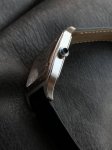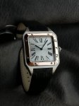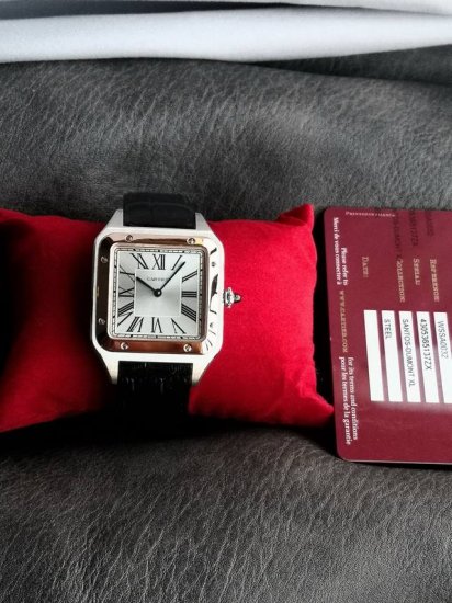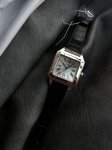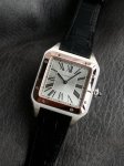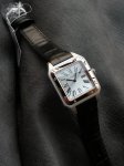 卡地亚山度士系列W2Sa0017腕表,精钢表壳搭配黑色意大利进口小牛皮表带,红金表圈,镀银磨砂表盘,剑形蓝钢指针,搭载自动机芯,尺寸:46.6 X 33.9毫米。 DDD