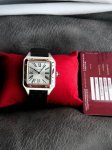 / 卡地亚山度士系列W2Sa0017腕表,精钢表壳搭配黑色意大利进口小牛皮表带,红金表圈,镀银磨砂表盘,剑形蓝钢指针,搭载自动机芯,尺寸:46.6 X 33.9毫米