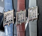 卡地亚Tank四边形镂空系列 Tw独家首发打造最强 参数与同步 表径:47.15 X 26.2毫米 机芯:瑞士朗达4S20改制机械款机芯 表壳厚度:7.82毫米 表盘颜色:镂空 表盘形状:四边形 Sku:银色银圈 银色镶石 玫瑰金 表带颜色:灰色 蓝色 咖啡色 进口小牛皮 表扣类型:经典针扣 背透:背透 镜面:蓝宝石镜面 指针:蓝色烧钢蓝指针 表冠:宝石镶嵌表冠