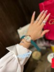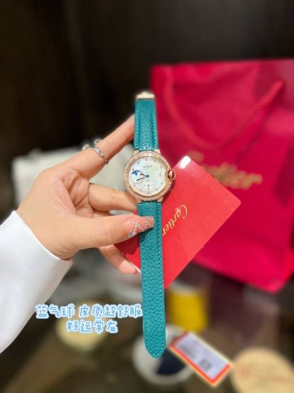 卡地亚 完美的治愈色 很气质的颜色,荔枝纹皮饱和度恰到好处,细腻的羊皮戴上手超级柔软舒适自然的奶油感,简直不要太小清新,关键是超显高档 卡地亚蓝气球镶钻珍珠贝壳面星空运转 奢华实物超美瑞士石英尺寸36Mm 力荐入手