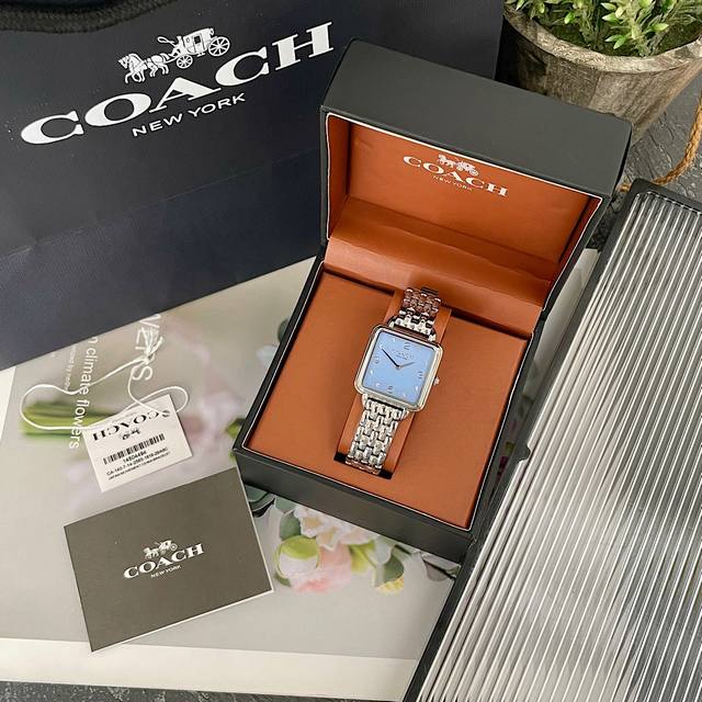 / 最新款出货~原单Coach 女士手表小方表,造型赋予Cass 腕表现代而独特的风格。蒂芙尼蓝面~设计光滑的链式、漆面表盘,并饰有数字和闪亮水晶标记。型号:145