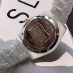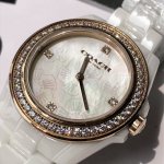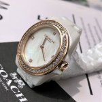 针款!蔻驰Coach陶瓷系列又来新品啦!表径~32Mm,盈润舒适的陶瓷材质石英女表,精致贝母表面上那若隐若现的茶玫瑰印花,简直太少女心了!简约的风格和现代与经典的巧妙结合,陶瓷表带搭配时间刻度表壳,清新亮丽的设计风格,日常百搭~最主要的是它的表盘外圈整圈都采用了水晶镶钻,在阳光下非常的闪耀。表带纯净无暇的白色陶瓷优雅又百搭了,这不单单是一款可以看时间的手表,更是腕间绝美的配饰~,配全套专柜包装!