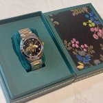/ 古驰 Gucci专柜最新款。抛光不锈钢薄表壳,38Mm29Mm情侣表。搭配interlocking G表冠,极具创意的蛇形网表盘,配以星星和星球图案,Gucci
