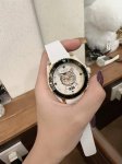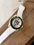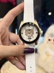 古驰 Gucci新款中性潜水表,40 Mm表径,以品牌标志性“猫”图案和夜光显示为表盘。应用不锈钢材质,经缎面拉丝润饰,并搭配与表盘配色一致的橡胶表带。表盘单向