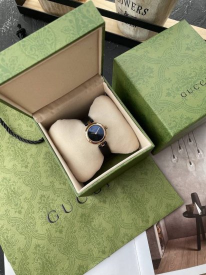 / 古驰Gucci石英女表. 原装瑞士机芯、蓝宝石镜面、菱形图案表盘、不锈钢表壳表扣、小牛皮表带. 表径2732Mm,完美品质。 纹理壳
