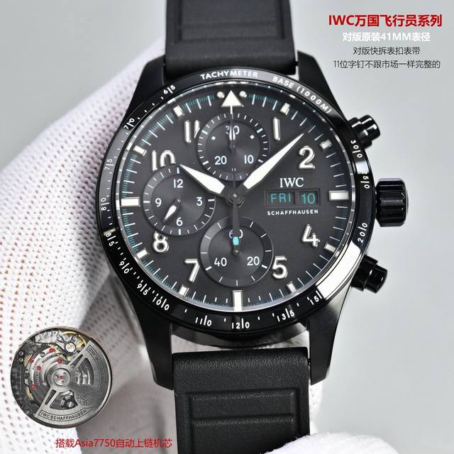 爆炸万国Iwc新款赛车飞行员 Ddd 飞行员系列高性能计时腕表,41毫米的表径,完美适配陶瓷测速圈。 Ddd Jp 机芯采用Asia7750透底复刻万国的69385自动上链机。双面蓝宝石玻璃,手工拉沙的表壳,质感十足! Ddd Jp 家表盘正品开模,无限接近!3个小眼与官方一样大小,一样位置!非市场缩小型3小眼 位置不对,大小不对 镶嵌式刻度与阿拉伯数字时标,表盘更新为亮黑色,与闪亮的测速圈完美呼应,3个小眼采用下沉式设计,让整表更有层次感! Ddd Jp 家采用原版快拆型氟橡胶表带快拆表扣,无需工具,即