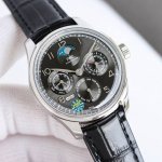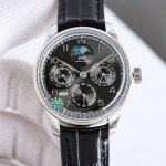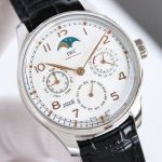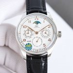白壳,玫壳 Gr新品 万国葡萄牙系列万年历腕表,复刻界最复杂的腕表,所有功能同步原装,所有功能调节通过把头控制. 1 功能介绍 12点日月星辰,9点钟独立小秒针和星期指针显示,6点钟月份指针,同时联动7点钟位置的年份显示,每12个月年份跳动一下,3点钟则是最经典的动力显示指针和日期显示。 2 做工精细 外壳采用原版同样的三件套结构,中间拉丝,上下壳为抛光,镜面采用高成本的锅盖形蓝宝石,使其质感提升。 3 机芯性能 尺寸42.2Mmx14.9Mm,机芯采用日本进口9015机芯,高效稳定,动力时间长达72小时