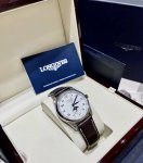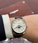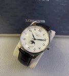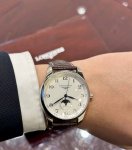 浪琴名匠月相表真的太赞啦!它的月相显示功能超迷人,6点钟位置的月相盘,能清晰呈现月亮阴晴圆缺,让你感受时光流转与自然韵律。表盘采用经典圆形设计,搭配银色“麦粒”饰纹,层次感丰富,在不同光线下美轮美奂,蓝钢指针色泽温润,与表盘相得益彰,使时间读取清晰又美观。表壳是精钢材质,坚固耐用且光泽度好,还具备3巴防水性能,日常洗手、淋雨没问题。搭载L899自动上链机芯,装配硅游丝,走时精准稳定,动力储存约72小时。不过它的表带是皮带材质,需要定期更换,一般2-3年更换一次,以确保佩戴舒适度和美观度。 DDD