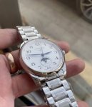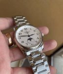 浪琴名匠系列四针月相系列机械全自动男表 40毫米大表盘 白色大麦盘面 淬火烤蓝柳叶指针 阿拉伯数字刻度 6点位日历显示 月相显示 蓝宝石镜面 搭载浪琴背透机械全