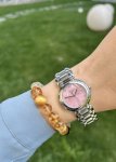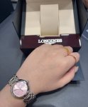 浪琴心月樱花粉 姐妹们,真的实物比官网图还要美10086倍!!! 实物不是俗气的亮粉,是那种超温柔的樱花粉,显得手腕又细又白高级感拉满! 30Mm表盘对小骨架太