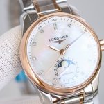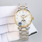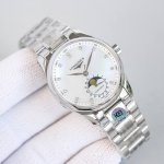精钢表壳的直径为34毫米,尺寸适中。珍珠母贝表盘在女表中是运用较多的元素,浪琴为其搭配了12颗钻石时标,将女性魅力发挥到极致。盘面6点钟位置的小表盘显示月相和日期,兼顾实用性和浪漫感,精巧别致。
