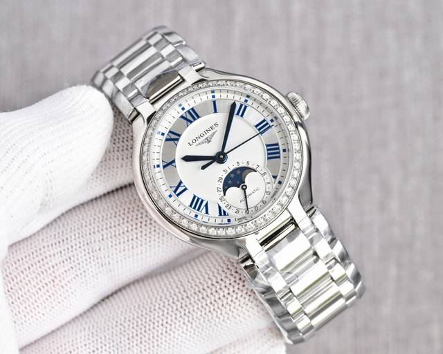 Longines浪琴 心月系列 石英机芯 月相镶钻 女表 瑞表 30.5Mm 贝母色表盘 精钢表壳 精钢表带