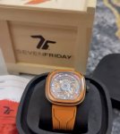 七个星期五橘色的整体颜色比想象中好搭配 刚开始可能觉得表盘戴着有点厚 自动上弦也方便很多走时也挺准 上手挺好看的橘色搭配衣服也比较显的年轻化 硅胶带就是出汗的时