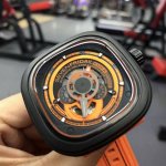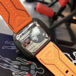 七个星期五Sevenfirday手表型号:p400 Ddd p400 Kuka Iii有着机器人般的精度,充分利用了橙色及六层细致的炮铜色界面。四个表盘自动运转,分 别显示小时、分钟、秒及日夜。橘色的时针顶部填满 了Super-Luminova夜光涂层。时钟指示盘的边缘 镶着橘色材料,表盘上的指示尖端点缀着Super-Lu- Minova夜光涂层。黑色表盘上的秒钟显示为橘色 数字,每隔十秒显示数字,从05秒开始显示数字, 至55秒结束。第四个表盘为显示24小时的白天夜晚 昼夜循环表盘,炮铜金属色显示为白天