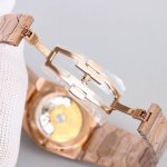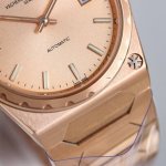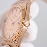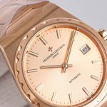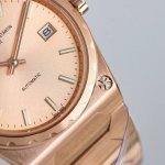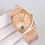 复古且时髦,深受众多明星追捧 江诗丹顿重新重磅推出历史名作系列标志性豪华运动型腕表以纪念品牌成立222周年。 DDD 表壳:尺寸37Mm X8Mm酒桶形采用三部分结构让整体并不显小,凹槽大齿轮表圈搭配5点钟位置的马耳他十字标志尽显其尊贵气息 DDD 表盘:金色.玫瑰金.拉丝银及拉丝灰搭配金属拉丝附有夜光涂层的条形时标及棒状指针,保留最经典的二针 DDD 机芯:9015改江诗丹顿自产24552机芯。从夹板到钢轮等部件均精工装饰,自动摆坨更是镀有22K黄金并篆刻222字体 DDD 表带:采用一体式六边型中央链