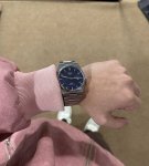 天梭的Prx是我最喜欢的系列,这块表我戴了也有小半年了,一直爱不释手。 精钢材质的表带和外观,银白色充满机械复古感。表盘是深蓝色,在光照下呈现由深蓝到浅蓝的渐变效果,这是其适合年轻刃佩戴的潮流点。 表盘也是很有特色,采用华夫饼盘面,很有个性张扬的感觉,但外观又特别低调。