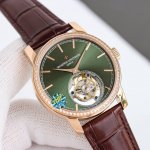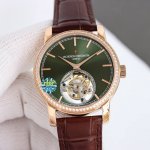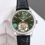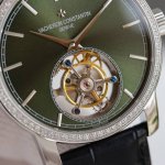 / 江诗丹顿全新Traditionnelle传袭系列陀飞轮腕表,经典设计焕然一新,展现出制表传统与现代美学的和谐相融,迷人的深绿色旭日纹表盘,搭配白金材质的棒状时标