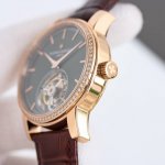 江诗丹顿全新Traditionnelle传袭系列陀飞轮腕表,经典设计焕然一新,展现出制表传统与现代美学的和谐相融,迷人的深绿色旭日纹表盘,搭配白金材质的棒状时标