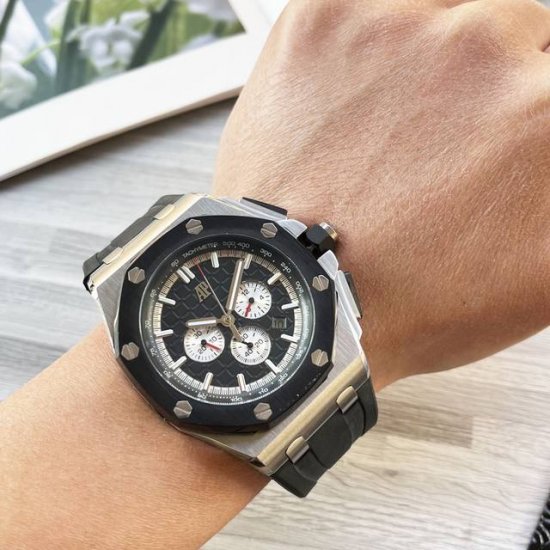 爱彼皇家橡树离岸型系列,自动上链机械机芯,316L精钢表壳,超高硬度水晶玻璃镜面,100米超强防水可潜水游泳44Mm表径,厚度14.4毫米和原版一致,表盘具有爱彼独家“MéGa Tapisserie”超大型格纹装饰,立体感极强,升级超强夜光功能,表壳整体全部Cnc处理,完美还原原装结构,表带为橡胶材质,柔软度与原装吻合,彰显男人霸气,皇家