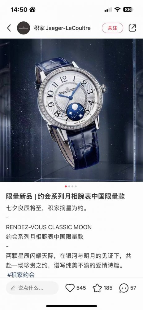 / 积家 约会女表,女人的三大梦想之一 积家约会系列高品质女表,日月星辰显示,进口石英机芯,原装折叠扣 精钢表带,尺寸宽33Mm,厚10Mm。