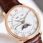 统一价: Ddd Mma强势推出宝珀Villeret经典系列6654全历月相腕表 Ddd 宝珀Villeret系列6654腕表,以优雅设计与精密制表工艺,诠释经典正装表的非凡魅力。40毫米抛光表壳线条圆润,搭配双层表圈设计,尽显低调奢华。乳白色或深色珐琅质感表盘上,罗马数字时标与柳叶形指针相得益彰,3点位星期与月份视窗、6点位浪漫月相及日期指针、12点位星期显示,布局和谐而富有层次。 Ddd 搭载品牌自产Caliber 6654自动上链机芯,配备硅游丝,提供72小时动力储存,确保精准走时。隐藏式调校按钮巧