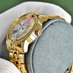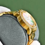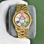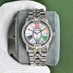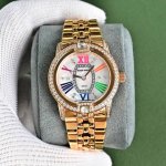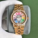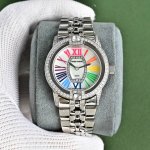 罗杰杜彼 升级版到货Velvett名伶系列 女士腕表 Velvet系列表盘线条鲜明有型,透过两个不同层次展现立体浮雕效果。数字和镶块位于表盘中心,表耳经悉心装饰,表売则介于圆形和酒桶型之间,带给视觉前所未见的独特美感。这款腕表以巧夺天工的技术和浪漫唯美的诗意重新诠释品牌的美学元素。表盘33Mm,篮宝镜面,经过圈口的二次改装,镶嵌顶级天然原产地晶莹剔透宝石,大闪亮,难度极高,目前同种材质最闪工艺。及精湛的宝石镶嵌工艺,杰出设计及珠宝完美融为一体!全新作品嵌入品牌独门所有的华丽美钻,具体升级细节如下: 表壳