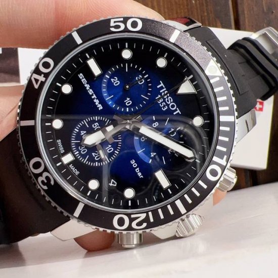 胶带系列,天梭T120六针最新款,原单正品,蓝宝石玻璃,原装瑞士机芯,表盘圈口可转动。316L精钢,表径45Mm!蓝宝石玻璃镜面。防水300米!三码合一,专柜全