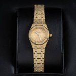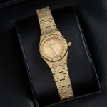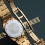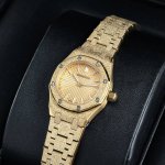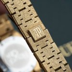 谁能拒绝这块爱彼霜金迷你23Mm 爱彼新出的这支皇家橡树67630Ba,把 贵气 展现到极致!表盘是细腻的沙金石肌理,光线底下会泛着细碎的光泽,格纹纹路和经典八