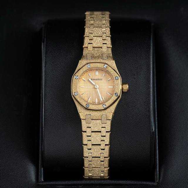 谁能拒绝这块爱彼霜金迷你23Mm Ddd 爱彼新出的这支皇家橡树67630Ba,把 贵气 展现到极致!表盘是细腻的沙金石肌理,光线底下会泛着细碎的光泽,格纹纹路和经典八角壳完美适配;全金表链做了磨砂处理,摸起来是低调的质感,不会像亮面那样显“俗”;把皇家橡树的硬朗和女性的柔美感平衡得刚好,抬手就是 毫不费力的贵 。是通勤能戴、约会能撑场的“全能款”,这波属于是把优雅刻进Dna了。搭载瑞士石英机芯,经典八角表壳,承续皇家橡树的标志性基因;全18K黄金打造,赋予腕表与生俱来的贵气底色。表盘采用沙金石材质,肌理