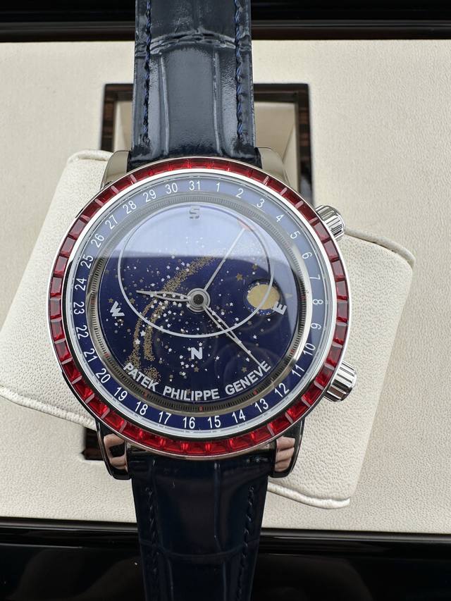 3K Factory 2025巅峰新作 -6104G 日内瓦苍穹系列 市场顶级神作震撼来袭! DDD 当星空化作腕间风景,3K Factory耗时两年匠心雕琢,将超级复杂功能美学演绎到极致!修正与官方完全一致的顺时针日历方向,星象功能直逼完美境界 表盘日内瓦真实苍穹图,搭配原装同源搪瓷白月相,月亮随自然周期自动阴晴圆缺,每一次抬腕都是与星空的对话。 DDD 搭载原装进口Miyota全自动机械机芯改制A.240机芯,搭配原装珍珠18K金自动锤,走时精准稳定,性能媲美;表圈镶嵌45颗璀璨宝石,表扣点缀28颗珍