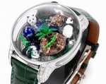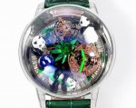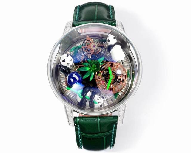 Jacob & Co 』捷克豹 天体艺术陀飞轮熊猫腕表. 生动展现竹林与熊猫的灵动世界,标志性的Astronomia机芯更赋予这款腕表独特的机械美学. DDD 当国宝攀上捷克豹的“天体”世界,原本霸气十足的Astronomia是不是也可爱许多?令人惊叹的艺术与无与伦比的工艺在Astronomia Art pandas中相遇。每一个手工雕刻和手绘的细节都将这个错综复杂的竹林和熊猫世界栩栩如生。这是我们致力于高级制表,将艺术性和卓越钟表相结合的精彩演绎。 DDD 47 Mm 精钢表壳 ,手工制作完成的3D熊猫