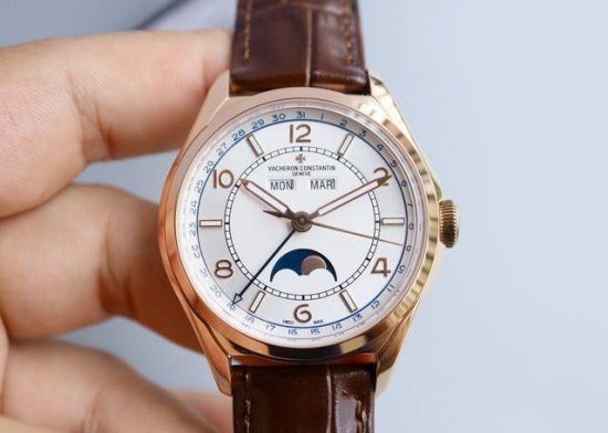 Mx厚积薄发 真“芯”力作 Vc伍陆之型 Fiftysix全日历系列 腕表 Ddd 型号 4000E000A-B548B439B438B065 Ddd 表壳 尺寸40Mm×11.6Mm,真正同步原装。旋入式表冠和造型独特的盒式蓝宝石水晶镜面,提升耐磨耐用性的同时,保留了Fiftysix伍陆之型系列的复古韵味。 Ddd 表盘 12点钟位置两个矩形视窗,分别可以显示星期和月份。日期显示位于表盘外缘,由带箭头的烤蓝指针指示。6点钟位置为月相显示,由蓝色的夜空和白金月亮组成。刻度圈配以白金材质的阿拉伯数字和棒状时