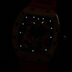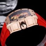 Richard Mille 理查米尔 Rm057 成龙盘龙陀飞轮腕表大胆运用全新性能的材质,延续奢华精致的时间艺术,将先进科技与精湛手工工艺完美融合,耗费无数个小时手工雕刻身披彩鳞的金龙,五趾龙爪紧握着陀飞轮夹板,气势磅礴,底板边缘刻有圆形的成龙的签名,代表着理查德米勒品牌与成龙之间的深厚友谊。机芯采用精准 稳定的陀飞轮手动机芯 壳身宽度45Mm 长度50Mm 搭配原装自动折叠表扣 独一无二 的创造力和大胆创新的品牌精神为腕表表界带来新的启发和冲击。