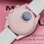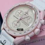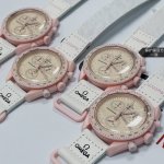 Swatch联名 DDD 款式3号 金星款 粉色。认准品质。价格p实惠。 DDD Swatch斯沃琪联名款 DDD 这款手表设计如此醒目,白色 Velcro 表带与柔和淡粉色调完美调和。椭圆形小表盘的边缘点缀钻石般的璀璨细节,增添一丝女性的优雅气息。时针、分针、计时秒针和计数针均以粉色呈现。 表壳字面官方一致。六字位暗纹官方一致。表镜中央S官方一致。后盖12点电池官方一致。深度防水。保护膜官方一致。高强夜光。所有表盘均饰有 X Swatch 品牌标志、经典的 Speedmaster 标志和全新 Moons