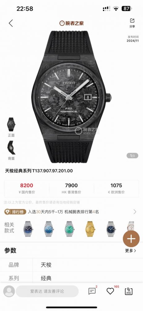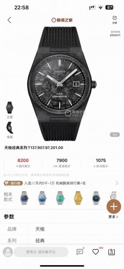 Ts-Factory巅峰复刻 天梭prx“黑武士”,碳纤维玩家终极之选 DDD 当极致工艺邂逅硬核美学,Ts-Factory全新力作 天梭prx超级玩家碳纤维黑武士,为真正的腕表爱好者而来。 DDD 表壳与表盘采用锻造碳纤维打造,完美复刻原厂细腻纹路,每一处细节都经得起最严苛的审视。40Mm黄金表径搭配11.23Mm纤薄厚度,贴合手腕的同时,尽显利落姿态。 DDD 内在搭载复刻版powermatic 80自动上链机芯,稳定精准;双面蓝宝石镜面覆蓝光镀膜,通透耐磨且质感出众。高品质氟橡胶表带带来极佳佩戴体验